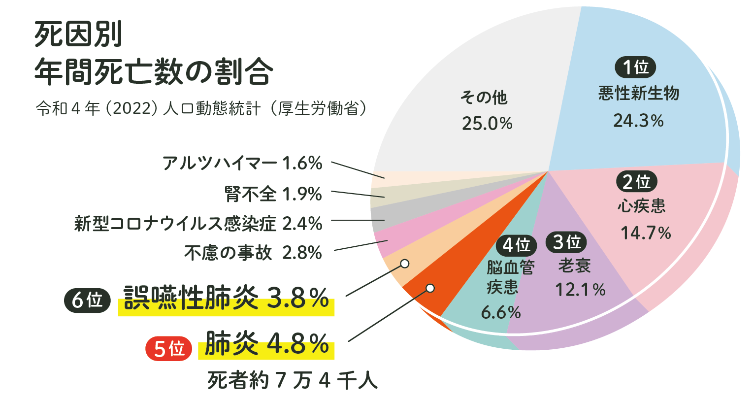 日本人の死因の第5位は肺炎です。また肺炎が原因で亡くなる65歳以上の高齢者のうち、96%が誤嚥性肺炎という報告もあります。
