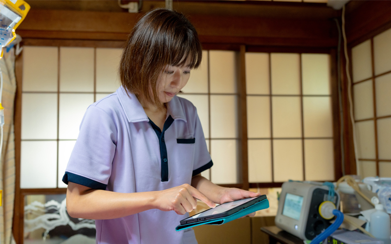 ご利用者・ご家族の日々の訪問看護記録(緊急性を要する事や要注意の状態の表示が可能)や画像、Web上での多職種との連携を図るなど、訪問看護には欠かせない道具の一つです。