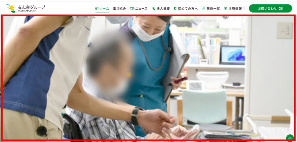 現象:PCで当法人のトップページを見ると、取り組みコンテンツのみが拡大表示される