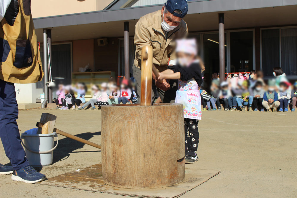 まずは、OBの方々のもちつきを見学。迫力のあるリズミカルなもちつきの様子に興味津々の子ども達!!皆真剣に見ていました。見学後は、子ども達も杵を持ちもちつきに挑戦。重い杵にびっくりする子もいましたが、それぞれ楽しみながら参加できました。お友だちを応援する『よいしょ』の元気な声が園庭に響き渡りました。