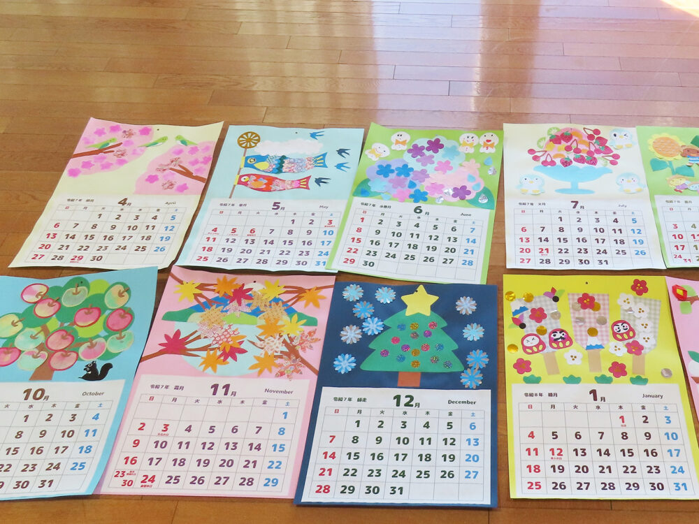 カレンダーは事前にそら組の子どもたちが、顔を描いたり、にじみ絵をしたり、スタンプを押したり、たくさんの準備を行いました。