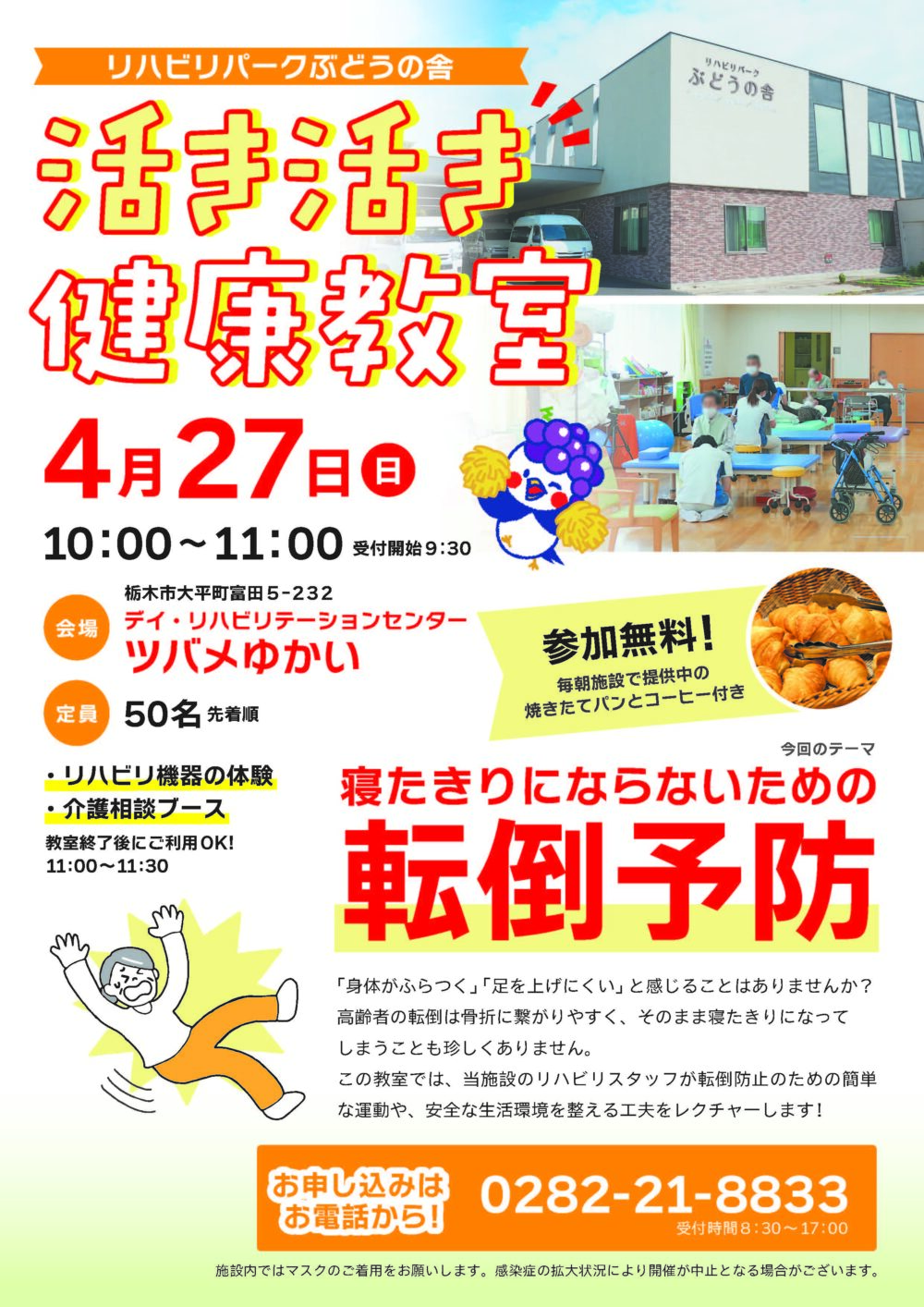介護老人保健施設ぶどうの舎(ツバメゆかい)では令和7年4月27日(日)に第1回活き活き健康教室を開催します。今回は寝たきりにならないための「転倒予防」がテーマです。リハビリスタッフから簡単な運動をレクチャーいたします。