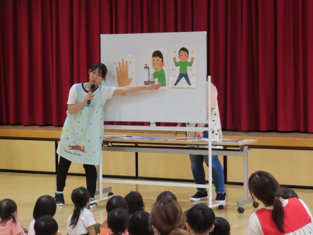 保健衛生の分科会による手洗い講習を行いました。つき・ほし・にじ・そら組がホールへ集合。なぜ手洗いは必要なのか?どのように手洗いするべきなのか?を学びました。