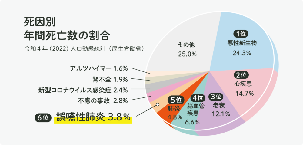 誤嚥性肺炎は日本人の死亡原因の第6位であり、特に高齢者の場合死亡率が高くなる傾向がある疾患です。