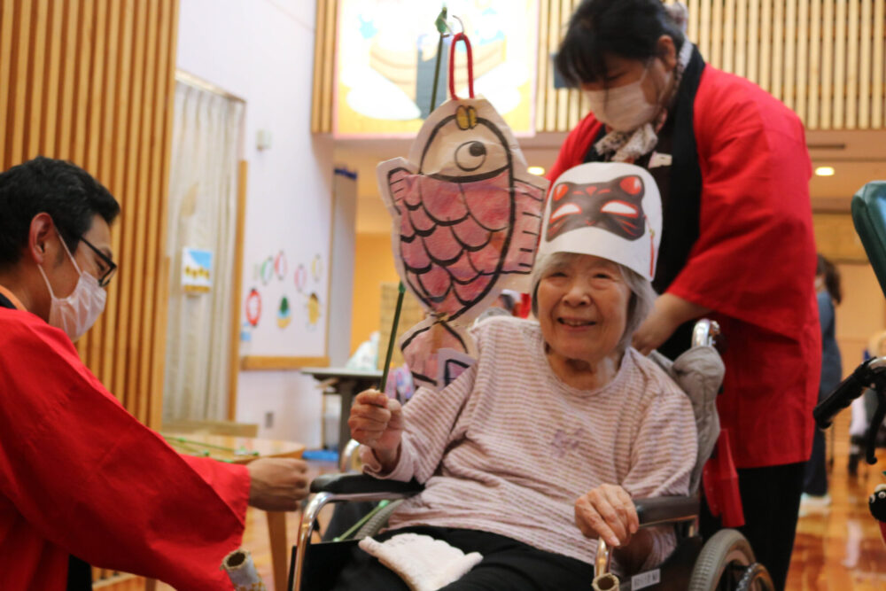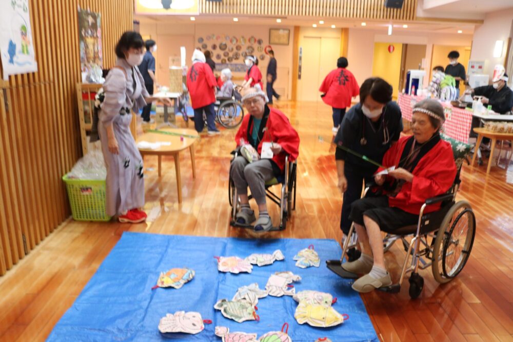 職員だけでなくご利用者も、法被を着たり、豆絞りの手ぬぐいを頭や首に巻いたりとお祭りを盛り上げていただきました。