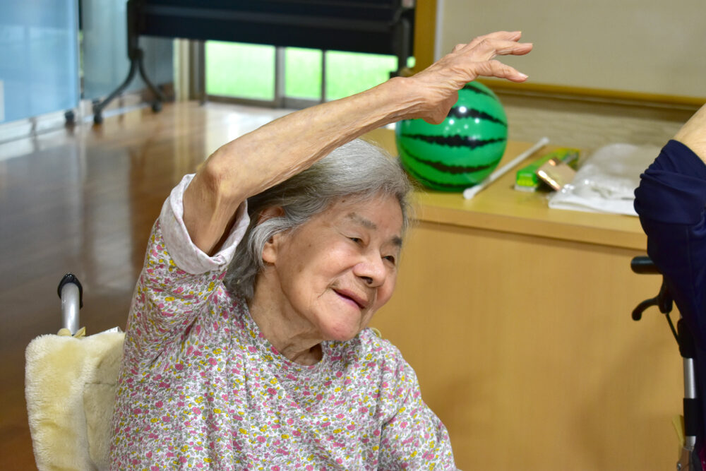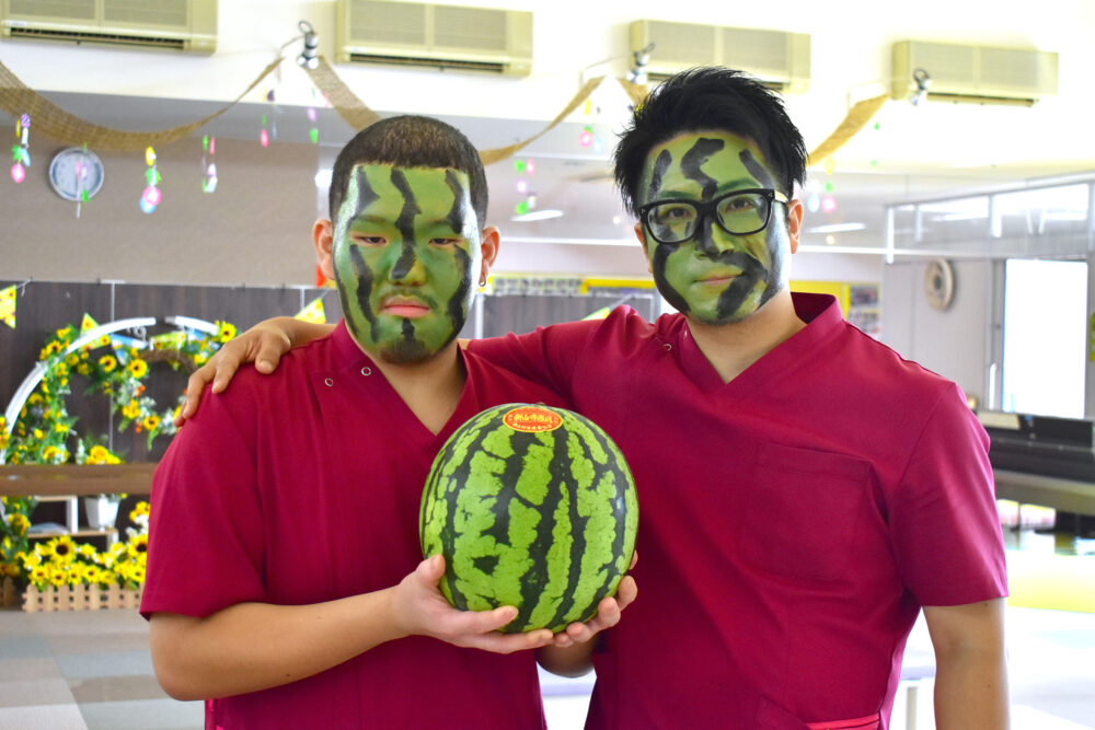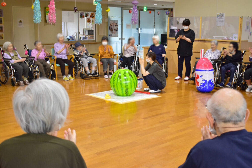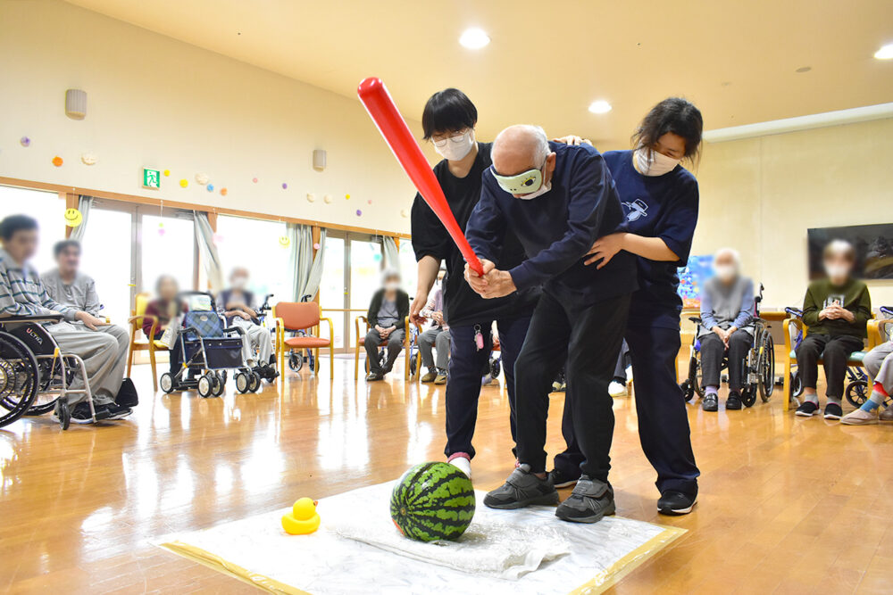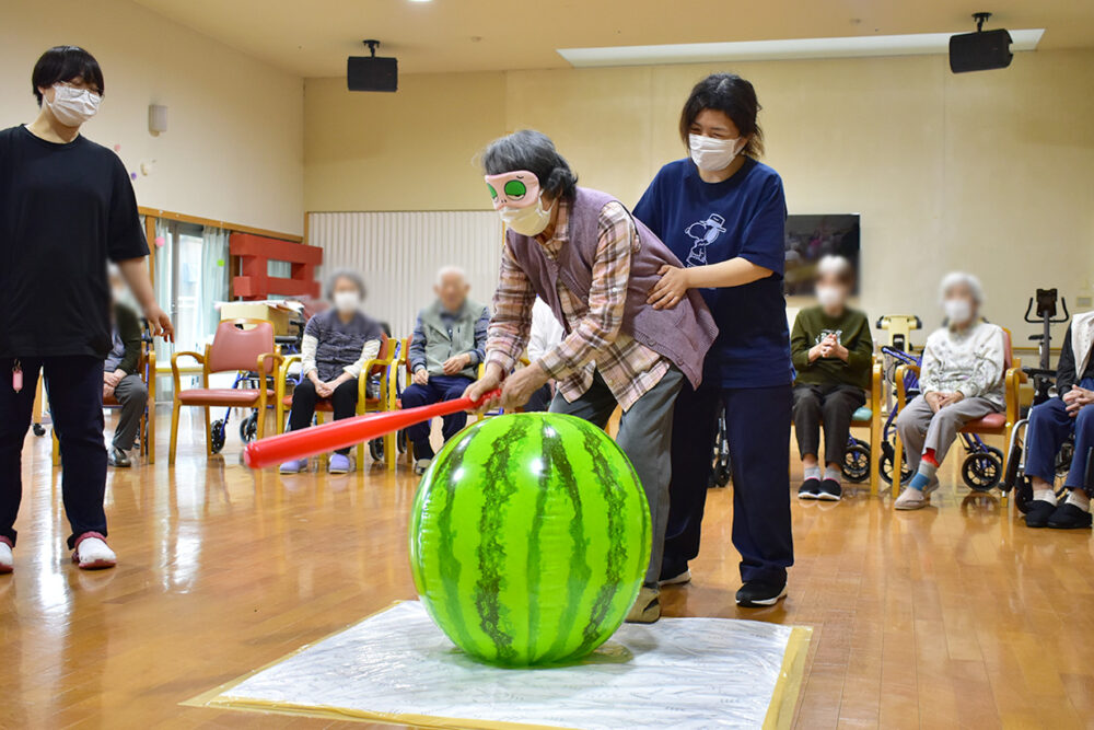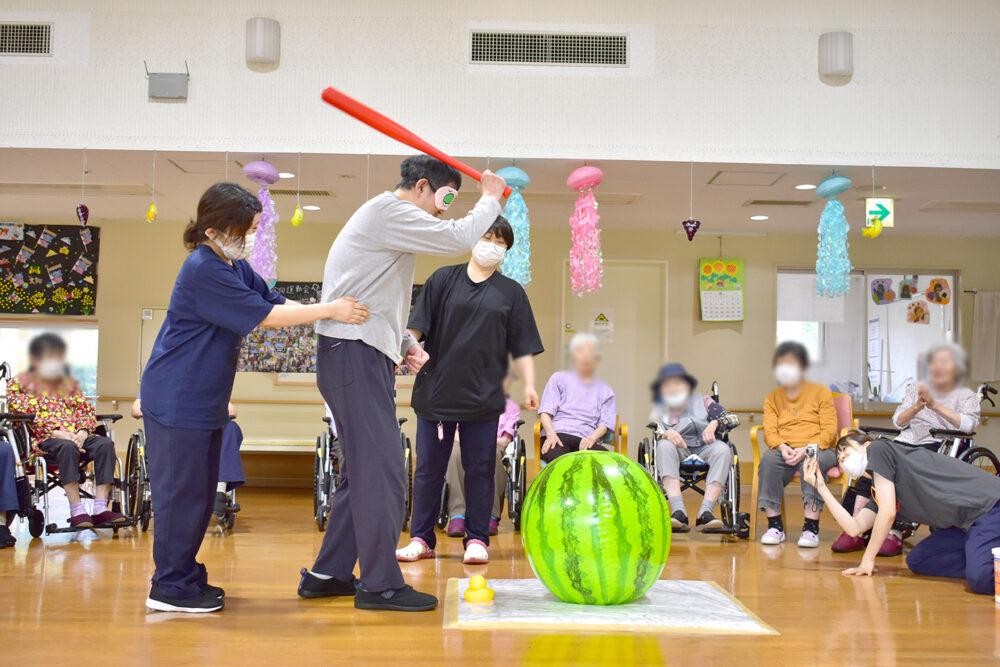 介護老人保健施設ひまわり荘では、夏の風物詩を楽しもうとすいか割りを行いました🍉