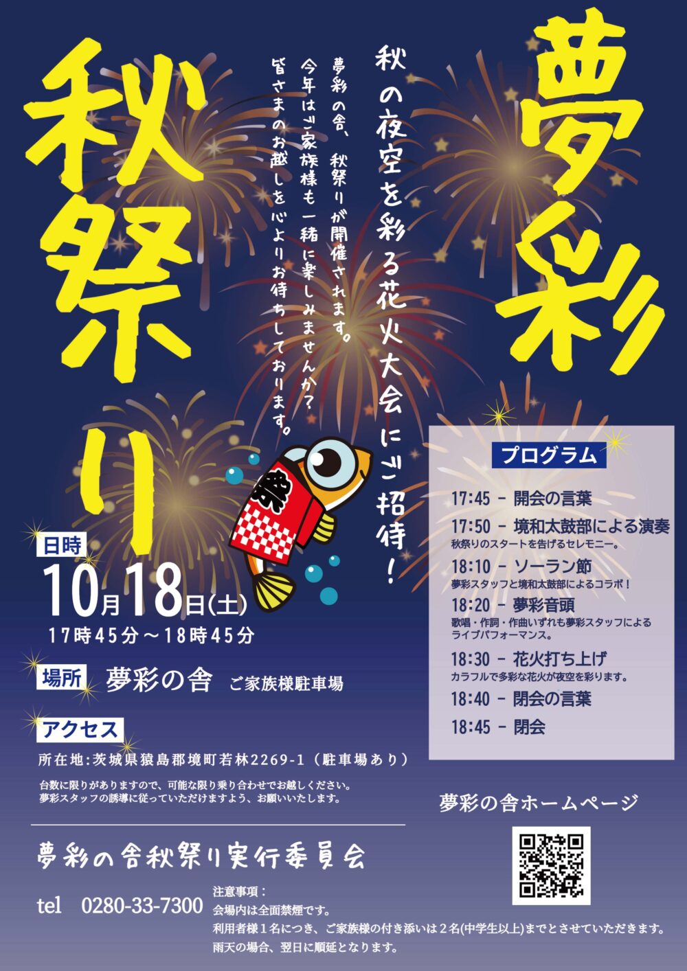 | 10月18日(土)NEW! | 夢彩の舎 夢彩秋祭り | 茨城県猿島郡境町 |