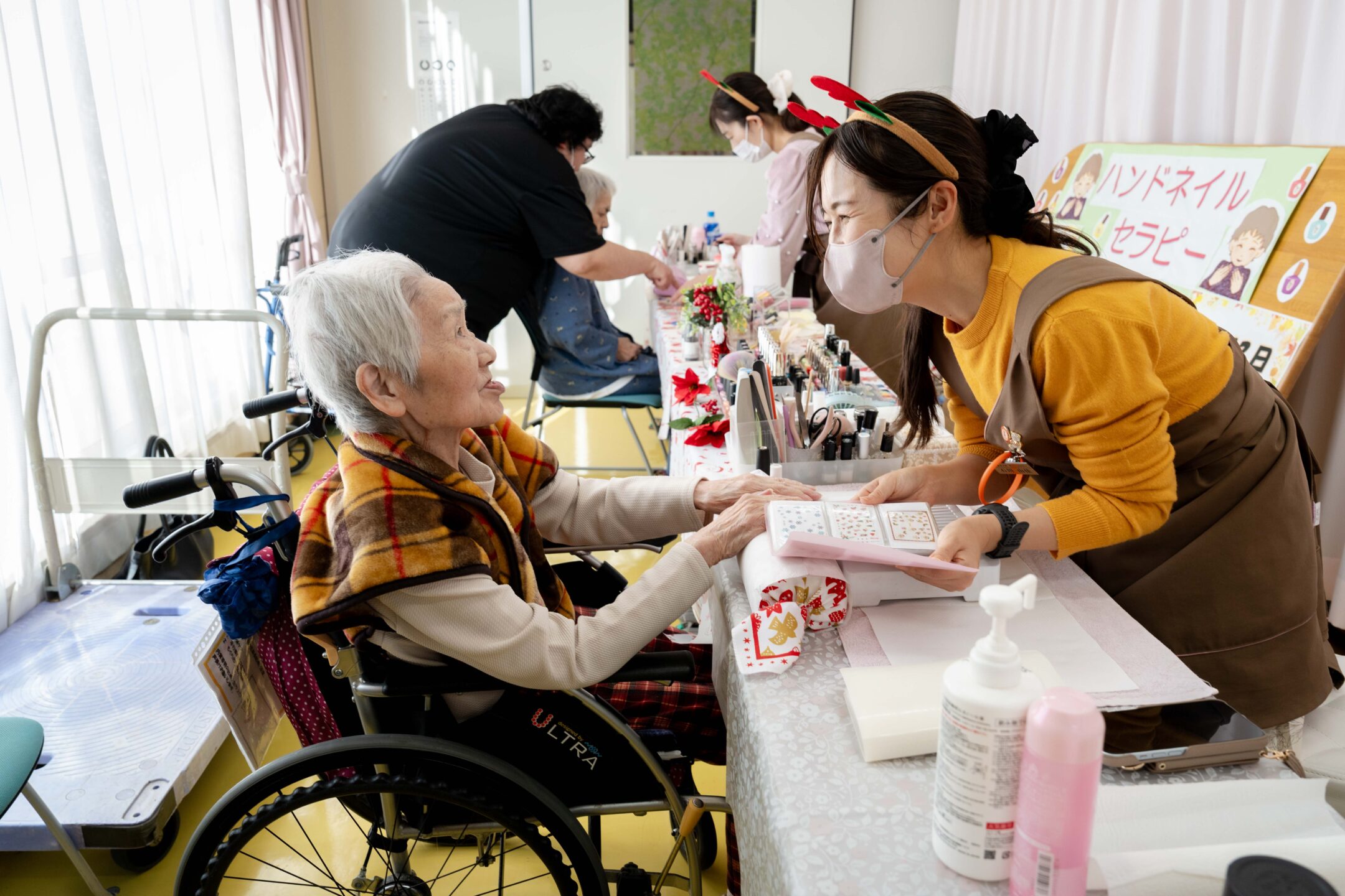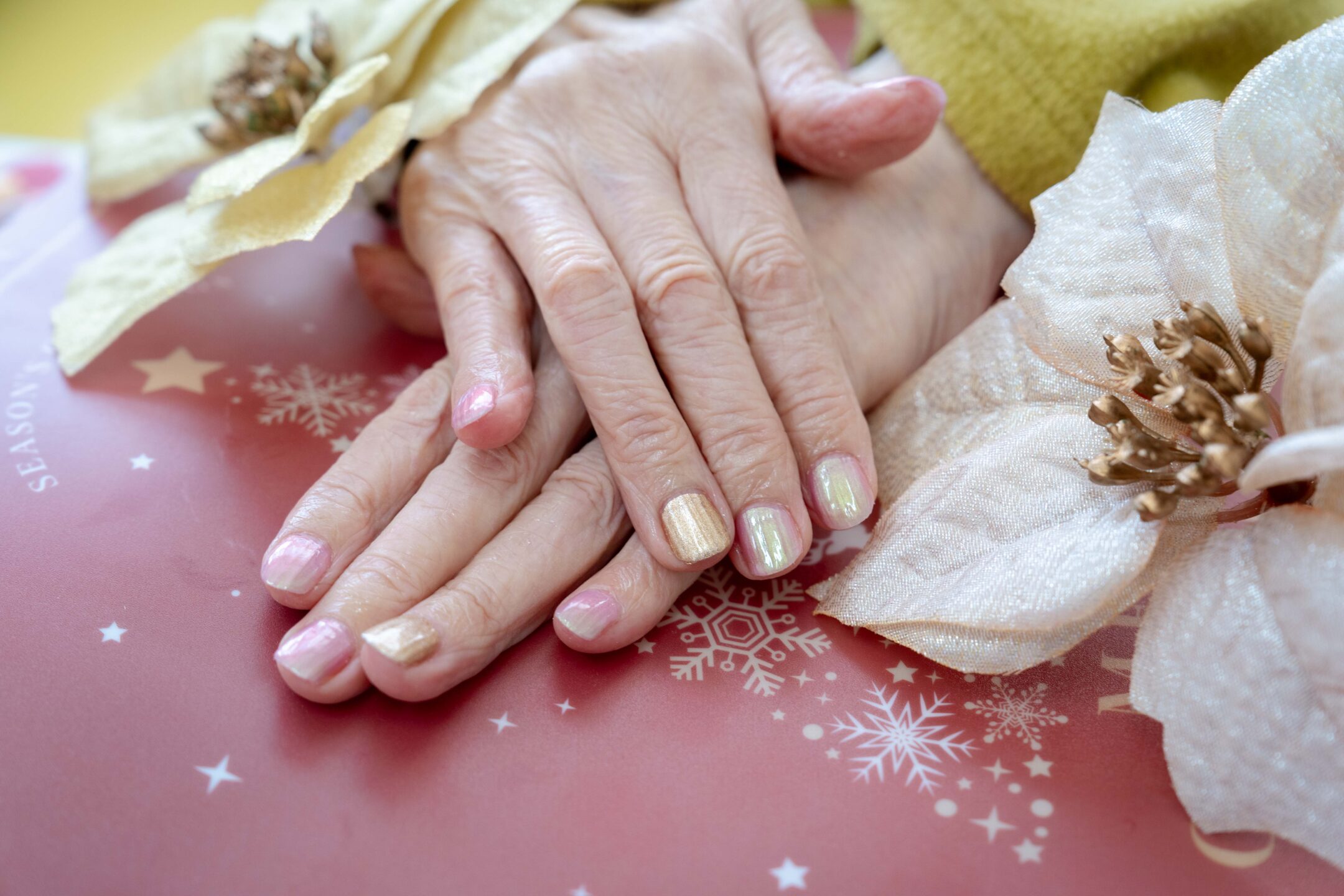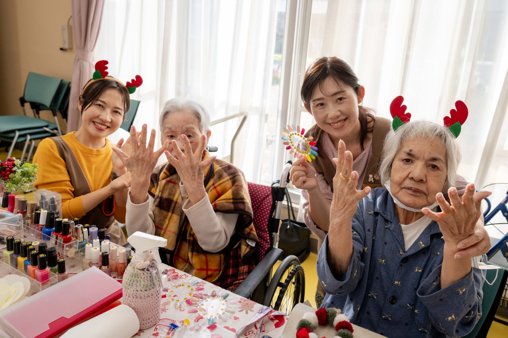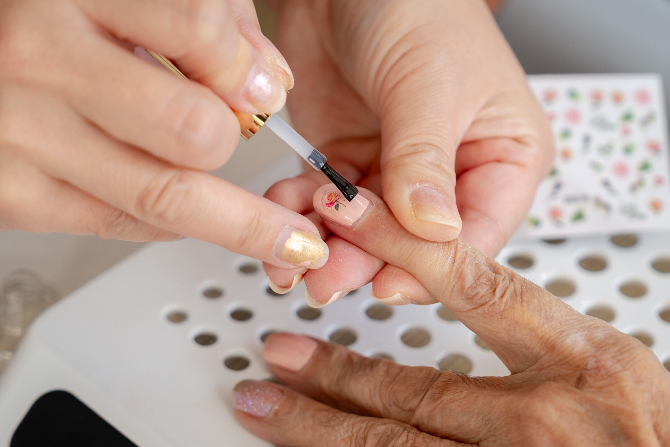 福祉ハンドセラピーは、ただ爪をおしゃれにするだけでなく、ご利用者とお話をしながら手や指を優しくマッサージすることで、笑顔と元気、そして癒しをお届けする活動です。この活動を通して、「介護の中に美容を取り入れる」ことをコンセプトに取り組まれています。