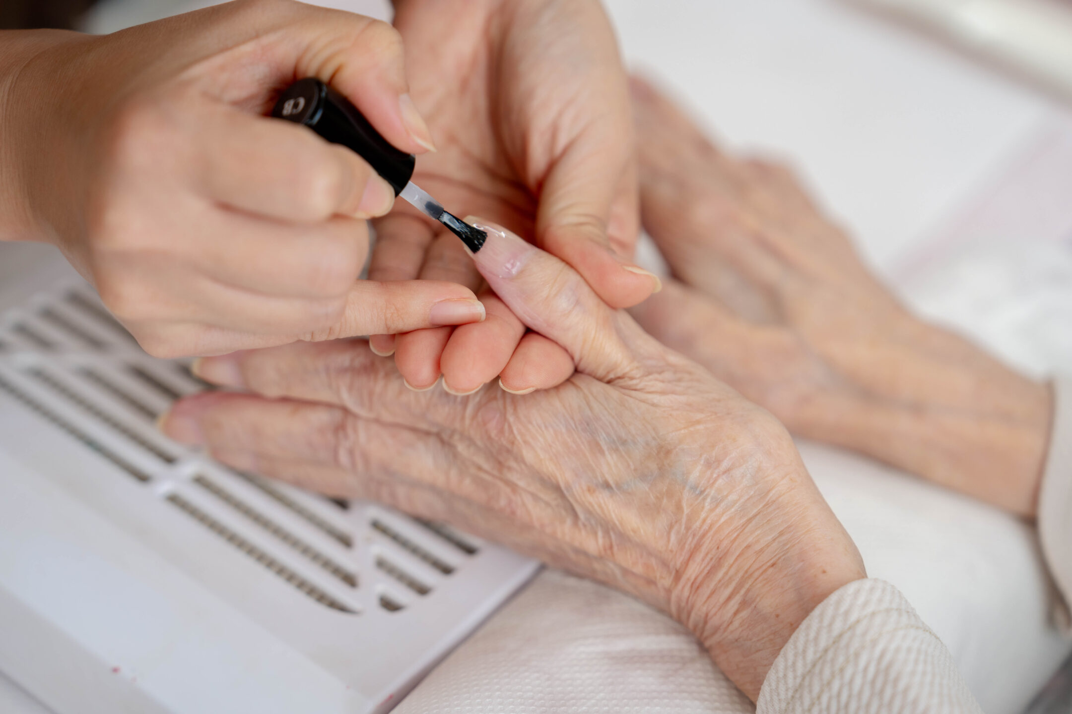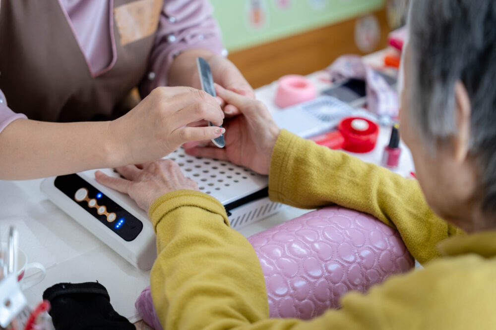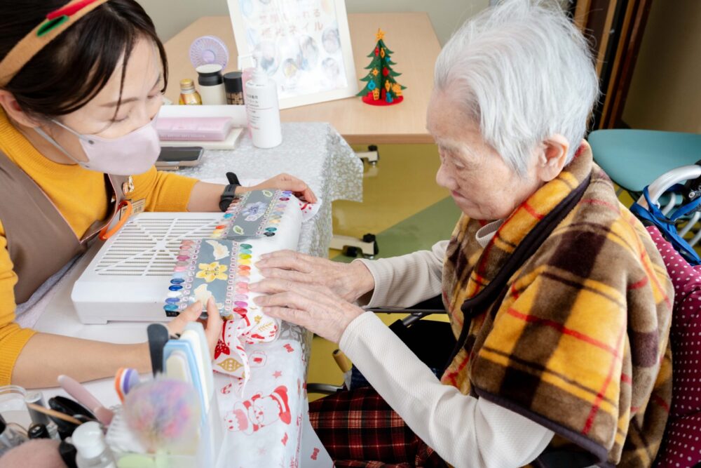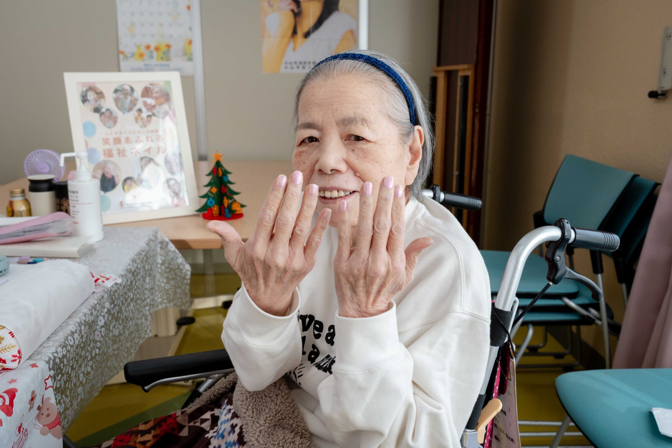 福祉ハンドセラピーは、ただ爪をおしゃれにするだけでなく、ご利用者とお話をしながら手や指を優しくマッサージすることで、笑顔と元気、そして癒しをお届けする活動です。この活動を通して、「介護の中に美容を取り入れる」ことをコンセプトに取り組まれています。