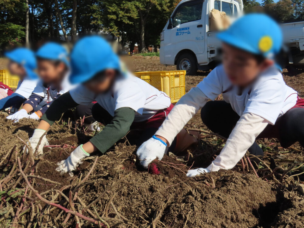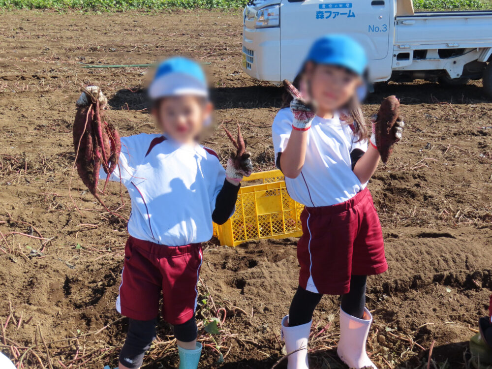 次々に掘れるおいもに大はしゃぎしながら、どんどん掘り進めていました。途中、土の感触を楽しんだり、虫探しをしたり、畑ならではの遊びも楽しみました。