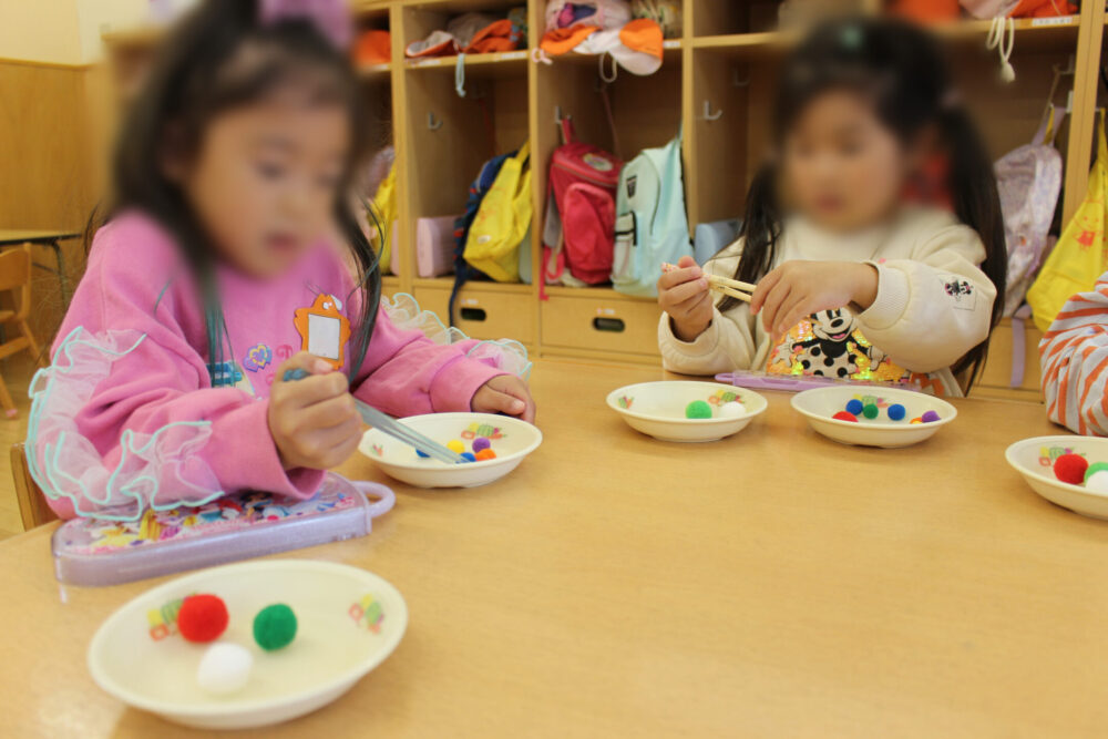 栄養士から、正しい箸の使い方や椅子の座り方を改めて学んだあと、子どもたちも箸を持って、スタート!まずはカラフルな小さめのボールで練習した後、大豆に挑戦しました。