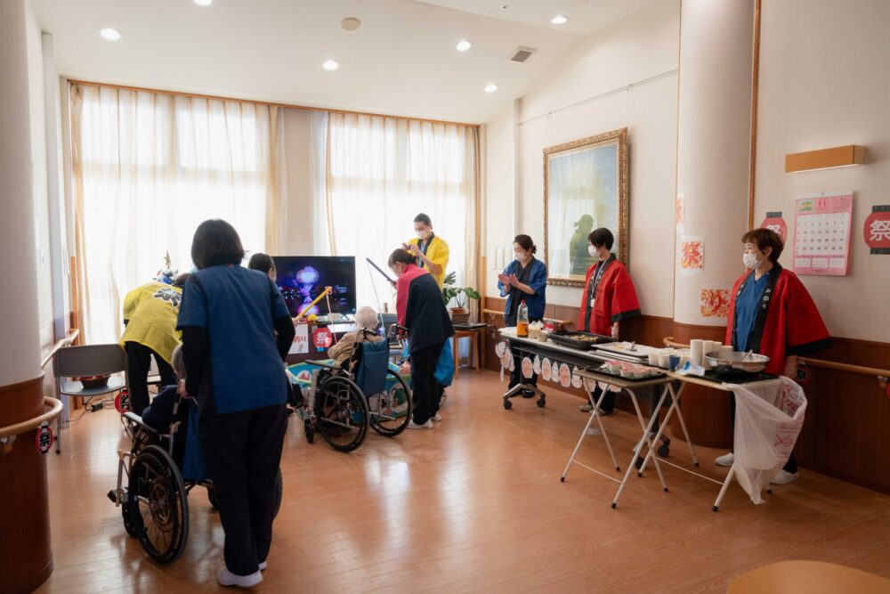 秋祭りは多目的ホールで行われ、ユニットごとにご利用者が順番に集まります。お出迎えするのは、法被姿の職員たちです!