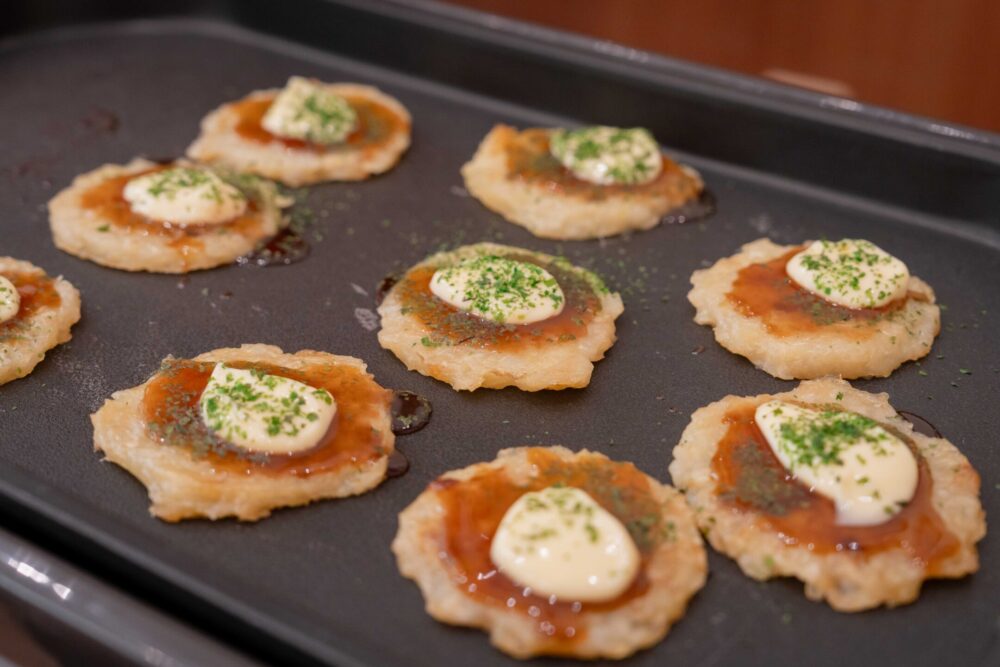 終了後は、職員手作りの甘酒とお好み焼きを提供。