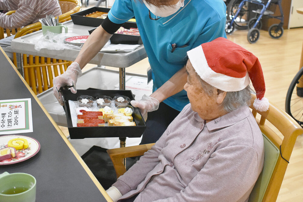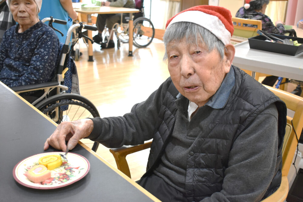 「今日はクリスマスが近いのでケーキを食べましょうね~!」との職員の声に、「賛成~!」とバンザイで喜ばれる方も😊