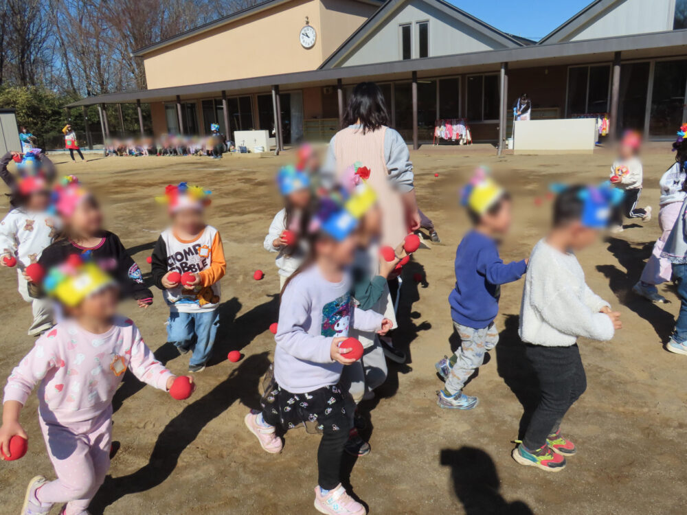 ほし・にじ・そら組は、クラスごとに、鬼の背負うかごに球を入れる、玉入れゲームを行いました。鬼に驚きながらもみんな楽しんでいました。節分の豆まきには、季節の変わり目に起こりやすい病気や災害を鬼に見立てて追い払う、邪気払いの意味があります。今年も元気に過ごせるよう願いたいと思います。