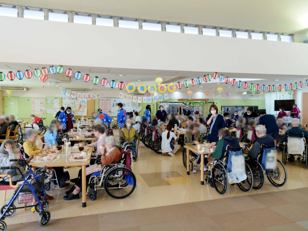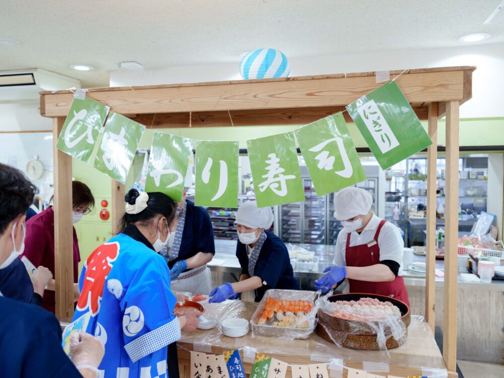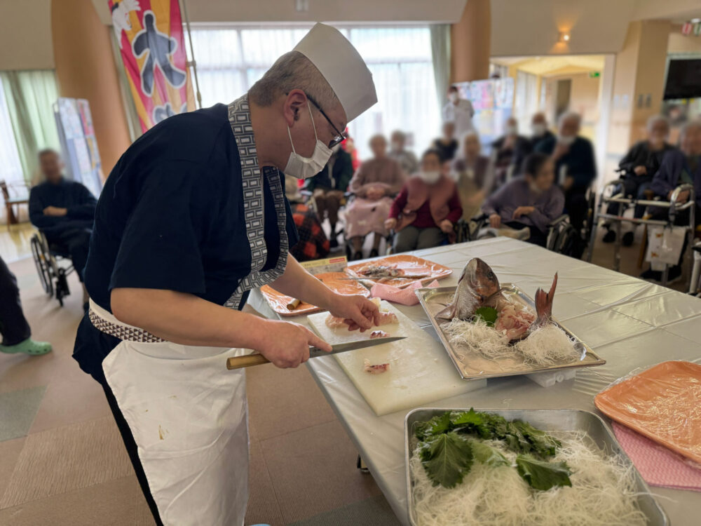 職人が鮮やかな手つきで大きな鯛をさばいていく様子に、ご利用者だけでなく、職員も釘付け。鋭い包丁が入り見事な活け造りが完成すると、「おおっ!」と歓声が上がりました。単に召し上がっていただくだけでなく、音、香り、そして職人の技を間近で感じる。この五感を揺さぶるライブ感が、ひまわり荘流のイベントです。