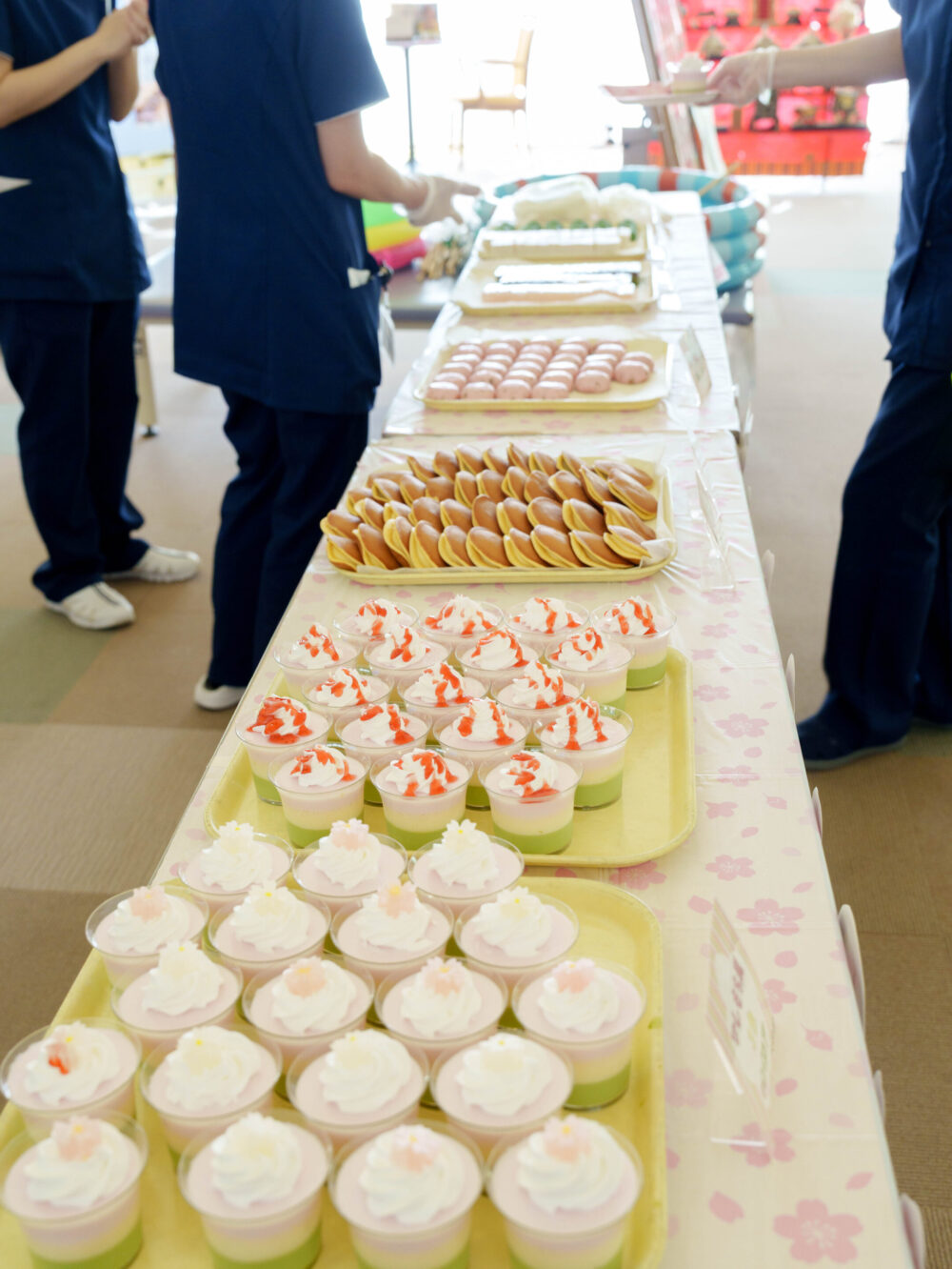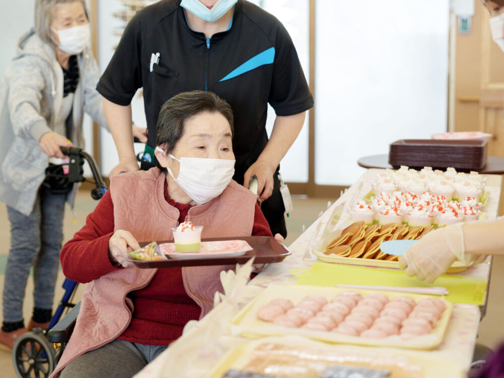午後のレクリエーションでは、管理栄養士がこの日のために腕を振るった「ひしもち風ババロア」や「どら焼き・お饅頭」がずらり!
