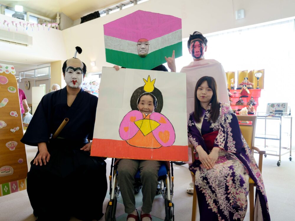 さらに、会場には手作りのお雛様とお内裏様、ひしもち、ぼんぼり(右上)になりきった職員、そしてお雛様とお内裏様の「顔出しパネル」が突如出現。お雛様やお内裏様になりきるご利用者と、負けじと体を張るスタッフたち。笑い声が絶えません。