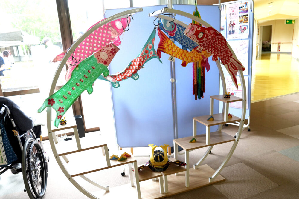 一方、室内はふと天井を見上げれば、悠々と泳ぐこいのぼりや兜(かぶと)の装飾が。