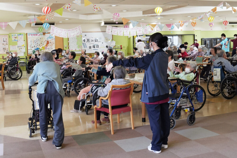 端午の節句を控えた季節感たっぷりのホールで、体操を行い、準備運動もバッチリ!